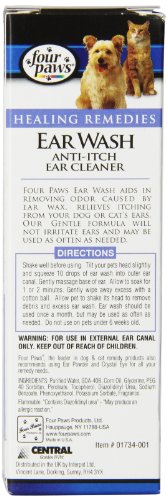 Product Description Four Paws Ear Wash helps relieve itching and keeps pet’s ears clean. Used by veterinarians and groomers to remove odor causing ear wax. 4 oz. (118 ml) 0