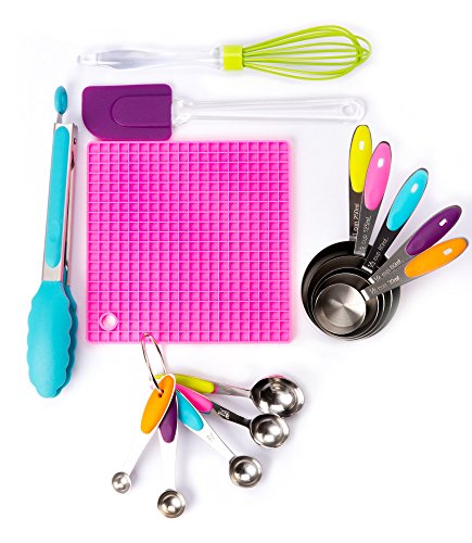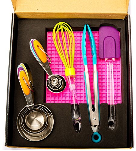 Stainless Steel Measuring Cups & Spoons with Silicone Utensil Set. This 14 piece Baking Set is ideal for the home cook, as a gift or housewarming present and is nicely presented in a perfect gift box.