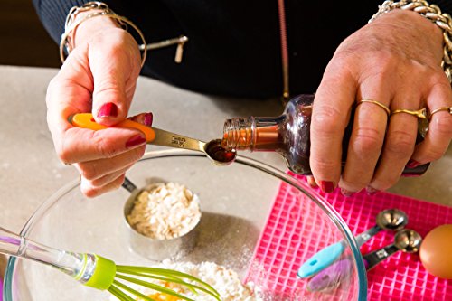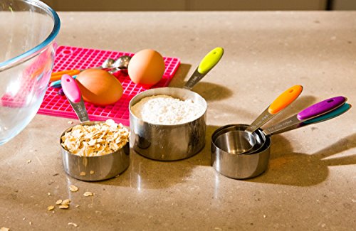 - Makes a Great Gift High Quality - Heavy Duty Stainless steel stackable measuring cups and spoons come with bright colored soft silicone handle grips to prevent heat from hot liquids and can be removed for deep cleaning. Each set can be kept together with the secure ring if required, are all engraved, come with easy to read measurement on the handles.