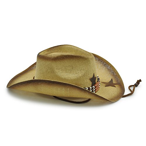 - Starlet is made of 100% paper drifter style cowboy style hat with tea stained star design. Offering one size fits most 3.5" rim with beaded accent conch