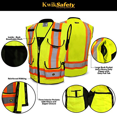 KwikSafety Presidential Hi Vis Yellow ANSI Class 2 Safety Vest | Two Tone Reinforced Polyester w/ Reflective Strips, 9 Pockets & Heavy Duty Zipper | Hi Viz Construction Surveyor Security | 2XL/3XL