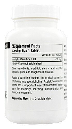 ReleaseDate : 2006-06-21 Studio : Source Naturals Publisher : Source Naturals Binding : Health and Beauty Product Description Dietary supplement. Acetyl L-carnitine is an amino acid-like compound that is related to choline and may assist in the conversion of choline into acetylcholine. Acetylcholine, one of the bodyÆs key neurotransmitters, chemically transmits messages from one nerve cell to another. These statements have not been evaluated by the Food and Drug Administration. This product is not intended to diagnose, treat, cure or prevent any disease. Suitable for vegetarians. Contains no yeast, dairy, egg, soy, sugar, starch, salt, preservatives, or artificial color, flavor or fragrance. 0