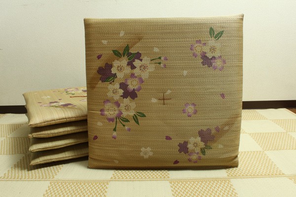 職人が1枚1枚手作業で捺染プリントを施したイ草座布団です。メセキ織という技法で柔らかい肌感触に仕上げました。またイ草の生地を縫製した後に、生地を湿らせ、裏返しにする『返し』という技法で仕上げております。イ草を通常曲げてはいけない方向に曲げますので、良い(太く強い)イ草でなければ作ることができません。返すことにより、ふっくらしたボリューム感を出しました。国産(九州産)のい草を使用しています。一本一本が太く、表皮が厚く繊維がキメ細かいので弾力性があり、耐久性に優れています。い草には空気の自然浄化作用、湿度の調節作用などがあります。また汚れにくく、使用するうちに黄金色に変化し味が出ます。い草に青森ヒバ加工を施しています(抗菌、防臭効果)。中材はウレタンをフェルトでサンドした三層構造で、適度なクッション性があります。※柄のプリントは職人が手作業で描く為、同じ色・柄であっても多少風合いが異なります。