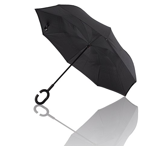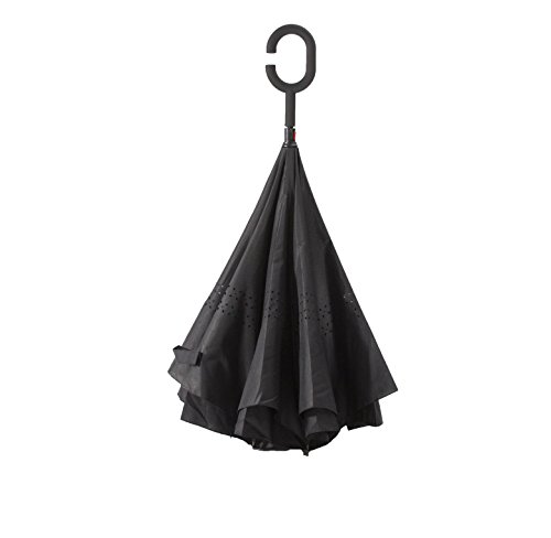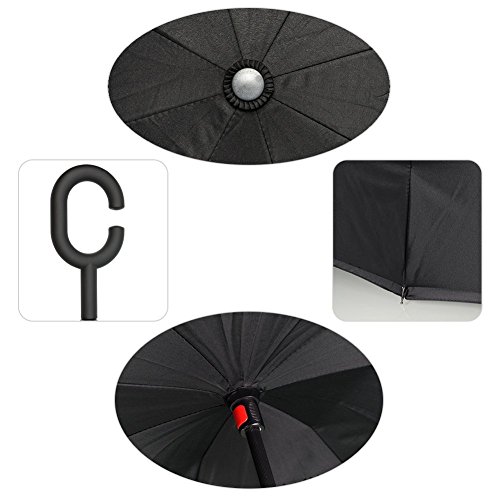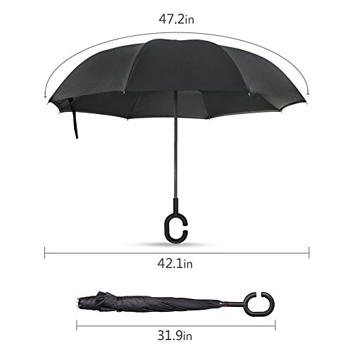 -. Feature : 1) WIND RESISTANT - close and re-open to move back into position every time the umbrella is flipped. / 2) EASY OPERATION - Press and release the open button before pushing the umbrella open. You will hear a click when it locks. On the initial opening, ribs may require gentle push to align in correct order. / 3) SMART DESIGN - The C-shaped C-handle allows you to keep the umbrella up without the use of your hands. The umbrella also has a self-standing design which allows it to stand on the ground without support. / 4) BEST QUALITY & LOOKS GREAT - A beautiful sleek black-coated metal design at the best price available. / 5) DURABLE MAKE - Made of pongee, water repellant coated cloth, fiberglass ribs, aluminum alloy central rod, breathable double layer windproof canopy and maintains the elegant rounded shape in strong winds.