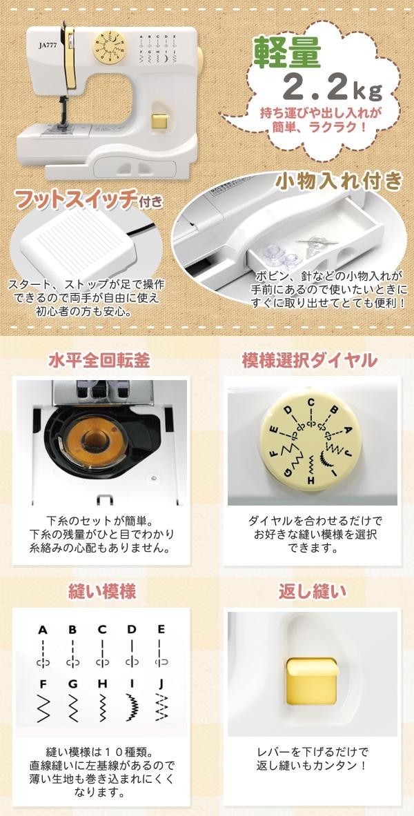 | 仕様 | 定格電圧:100V、50/60Hz 消費電力:6W スピード調節:一定速 水平釜:有 返し縫い:有 ミシンの駆動:フットスイッチ フリーアーム:有 上糸調節:有 ステッチパターン:10種類 直線縫い:5パターン ジグザグ縫い:3パターン 縫い速度:毎分350針 コード長/本体差し込みプラグ~フットスイッチ:136cm、本体差し込みプラグ~電源プラグ:175cm |