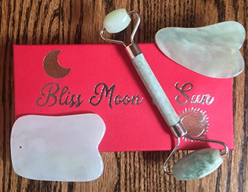 ✅ EXPERIENCE AGELESS BEAUTY - Bliss Moon & Sun Premium Jade Face Roller included with Two Gua Sha Scraping Stones is the perfect set of tools for a daily, revitalizing facial, neck and entire body massage, with proven benefits. Learn the traditional chinese massage and healing technique, "Gua Sha", here; https://trainedto.com/gua-sha-ultimate-guide/