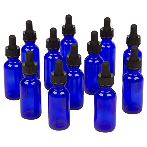 Blue Boston Round Bottles for Essential Oils and Liquids with Black Rubber Bulb Glass Droppers, 1 oz, Pack of 12