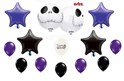 -. Feature : 1 - 15" Jack Skellington ORBZ Balloon / 2 - 19" Black Star Foil Balloons and 2 - 19" Purple Star Foil Balloons / 3 - Black 11" Latex Balloons and 3 - Purple 11" Latex Balloons / 1 - Ballooney's Trademarked Happy Birthday 11" latex Balloon / Ships Uninflated