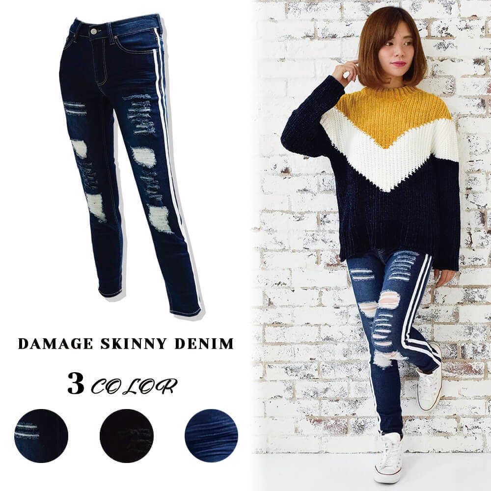 ライン入り破れ加工スキニー