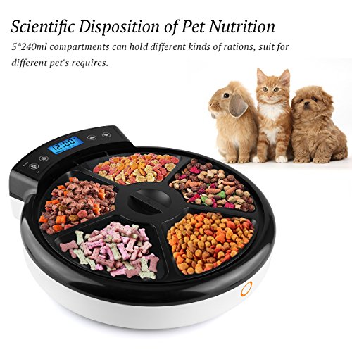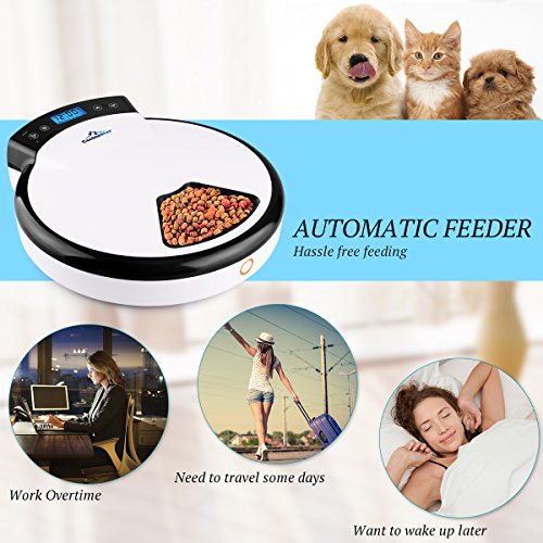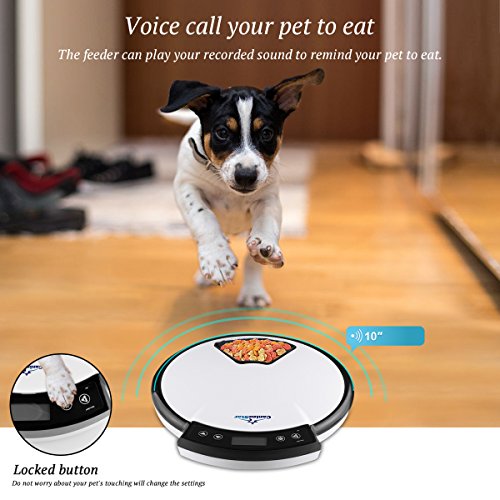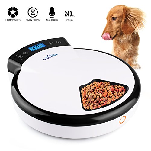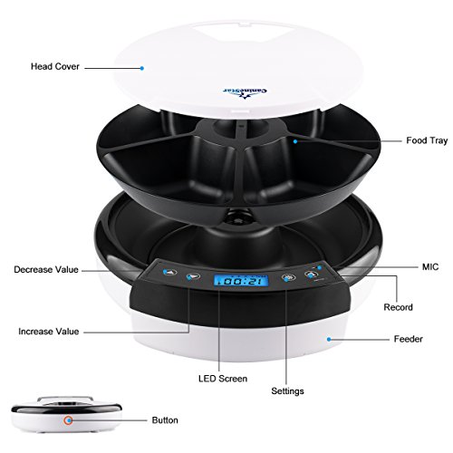 Studio : CanineStar Publisher : CanineStar Binding : Misc. Product Description Setup Instructions: 1. Please connect the DC 5V/1A cable or install 4 "C" batteries and then turn on the power switch, located on the back of the unit. 2. Next you must set the clock time. To do this hit the settings button until the LCD illuminates blue. Then hit the settings button again until the numbers on the left begin to blink. Use the arrows to adjust the numbers up and down. Do this for the numbers on the right as well. 3. Once you have set the time, you can go through each meal (1, 2, 3 and 4) and you can set the time you would like the food to be delivered. 4. To record a voice message simply hit the settings button until the blue LCD illuminates and then hold down the REC/LOBATT button located on the top left corner of the unit(MIC location). You have 10 seconds to record your message. Attention: 1. When electric cuts off, you need to reset the current time. The feeding schedule still remain due to the memory function. 2. When the blue backlight on LCD display turns off, the machine enters standby mode. Long press SET BUTTON for 3 seconds to unlock the screen for setting. 3. In order to have correct meal time, please set the local current time firstly. If the feeder was out of power and didn't have batteries for back up, the clock would not work either. 4. For multiple days setting, for example, if you want to feed your pet for one meal per day, you just need to set the current time and the first meal time, then press the SET button for 3 seconds to save and exit the meal time setting process. In this way, the feeder will feed your pet once per day and last for 5 days. Ditto, the same for 2 or more days settings. Specifications: Size: 12 inch ×13 inch ×3 inch Material: ABS Capacity: 240mL×5 (1.2 L in total) Battery: 4"C" size batteries (NOT included) Input power: DC 5V/1A cable (included) 0