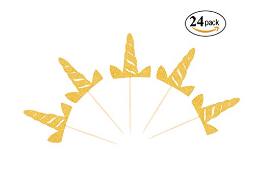 The set includes 24 glitter gold unicorn cupcake picks (single side);SIMPLE ASSEMBLY REQUIRED- Wood sticks and adhesive tape included for quick set-up.