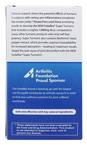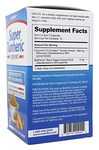 -. Feature : Supplement Facts - Serving Size: 2 Capsules / Servings Per Container: 15 / 1,000 Mg / Standardized To 95% Curcuminoiids / Clinical Research Shows The Powerful Effects Of Turmeric In Subjects With Various Pro-Inflammatory Complaints Like Tender Joints.Researchers Used These Promising Results To Devlop The New Instaflex Super Turmeric That Includes A Mighty 1,000Mg Dose, Compared To Many Other Turmeric Products With Only Half That Potency. Super Turmeric Also Contains Bioperine Black Pepper Extract, Which Provides Superior Bioavailability For Increased Absorption - Leading To Maximum Results. Target The Root Cause Of