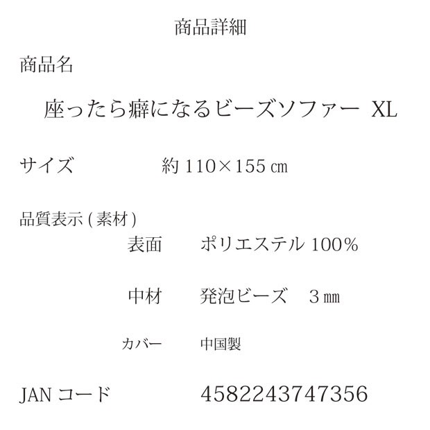 ◆組成 表地:ポリエステル100% 中材:発泡ビーズ カバー:中国製