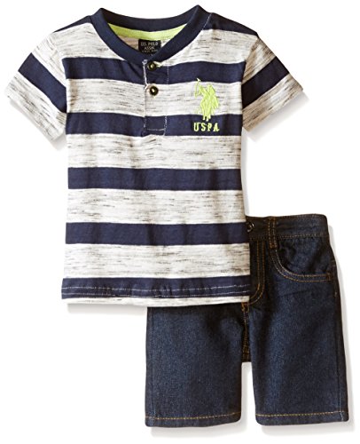 -. Binding : Apparel -. Brand : U.S. Polo Assn. -. Department : baby-boys -. Feature : Rib knit neckline / Large embroidered logo left chest / 5 pocket denim short has elastic back waistband / Buttons and hardware logo embossed -. Label : US Polo Assn. Children's Apparel -. Manufacturer : US Polo Assn. Children's Apparel -. Model : TJ00 -. PackageQuantity : 1 -. ProductGroup : Apparel -. ProductTypeName : SHORTS -. Publisher : US Polo Assn. Children's Apparel -. Studio : US Polo Assn. Children's Apparel -. Title : U.S. Polo Assn. Baby Boys' Striped Henley and Denim Short Set