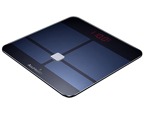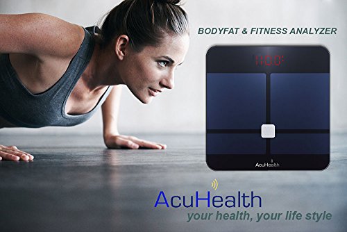 -. Feature : 10 PRECISION PHYSICAL HEALTH MEASUREMENTS - AcuHealth Smart Body Fat Scale monitors Body Weight, Body Water, Body Fat, BMI, BMR, Muscle Mass, Bone Mass, Visceral Fat and Physiological Age, great fitness monitor for healthy weight loss tracking. / BLUETOOTH 4.0 CONNECTIVITY - Compatible with iOS and Android smart phone Mobile Devices - Stores and displays body measurement histories for up to 10 different users with graphical diagram. Support Android 4.3 and IOS 6.1 and up. / INSTANT SETUP - Download the App by scanning QR code or visit the App store, connect to the "AcuHealth" app wirelessly to further track an assortment of other body indexes and store all readings. / MASSIVE 10 USERS TRACKING MANAGEMENT - AcuHealth digital smart body fat scale tracks up to 10 users at a time that works flawlessly with AcuHealth App. Break down fat loss and fortify exercise routines with individualized graphs and charts. / HIGH QUALITY AND STYLISH DESIGN - More than a high-quality fat loss tracker or weight scale, it also boasts crystal clear 3.3" backlit LCD display. The elegant and artistic design is truly for dressing room, bathroom, kitchen and home decor. A great item for personal use or as a gift for friends and family members.