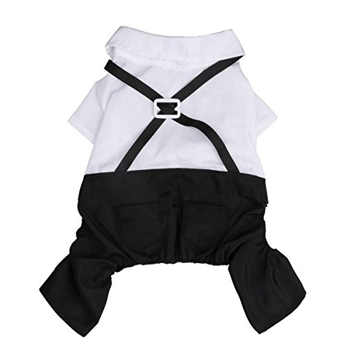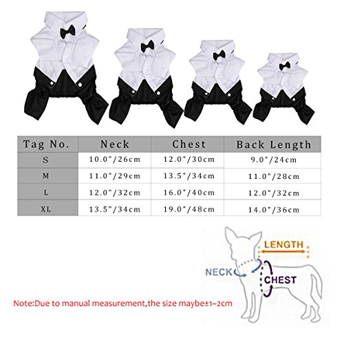 -. Feature : Pet puppy tuxedo is made of nylon material, comfortable to wear. / A bowtie attached to the neck, straps crossed at the back, making your puppy more gentle and cute. / Design with press buttons at chest, easy to put on and take off. / Great for parties, birthdays, photo shooting or other special occasions. / Please check the size table carefully before purchasing.