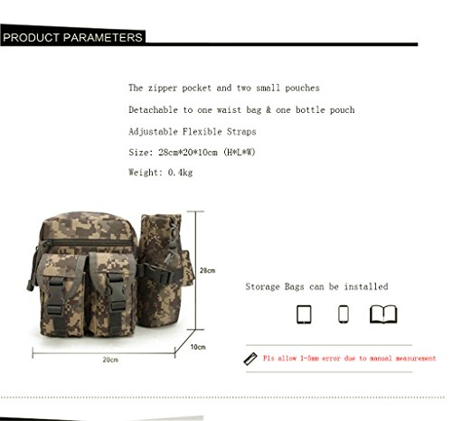 -. Feature : Materials: Made of High-density 1000D Oxford nylon fabric (More stronger than any other ones in the market 600D) and quality ABS buckle, light weight and durable. Length: 20cm; Width: 10cm; High: 28cm; Strap length over all: 75cm/95cm (Can be adjusted) / Small, Compact, Goes Anywhere Design is Perfect Where Large Packs are Too Big, Too Bulky, Too Heavy. / The LARGE MAIN COMPARTMENT is big enough for carrying your glasses, keys, food, umbrella, etc. The zippered POCKET is hidden for extra protection about your passport, ID card, Credit card, wallet and essential stuffs. The Water Bottle Pocket Holder is a nice size and easily fits a standard 500ml bottle. This water pocket is detachable according to ones choice. / Scratch-resistant , good toughness; High strength nylon buckle, cold-resistant, high temperature resistant; High strength metal, double pull head, durability material . / Perfect for jogging, walking, cycling, hiking, hunting, camping, travel, mountain, trekking, outdoor sports, holidays and leisure life.