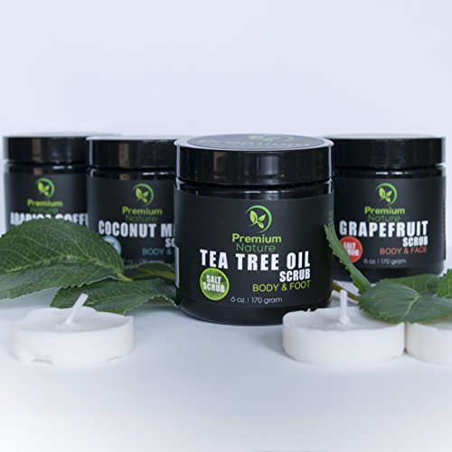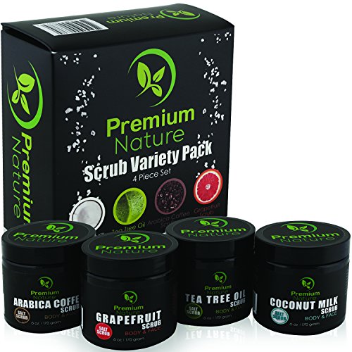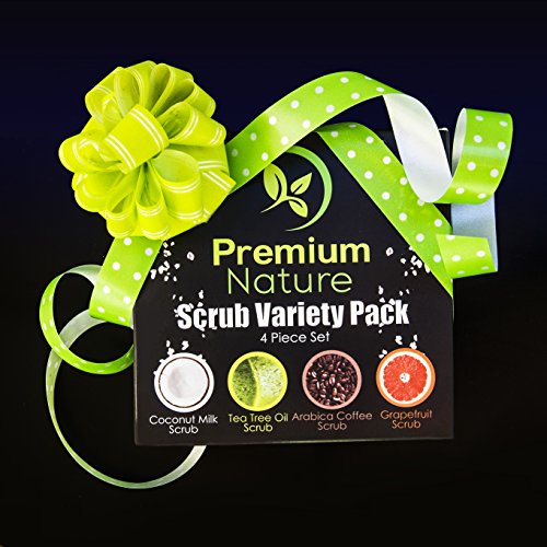 Body Scrubs Gift Variety 4 Pack 6 oz each, Grapefruit, Coffee, Tea Tree Oil & Coconut Milk Scrub by Premium Nature