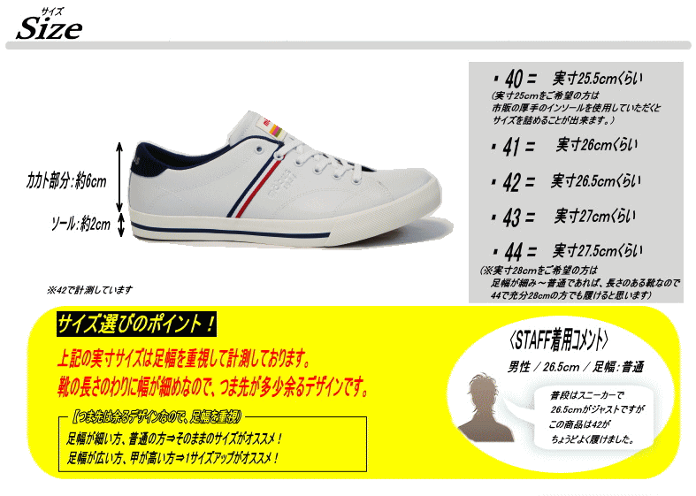 | サイズ | 作り⇒幅細め 【サイズ選びのポイント!】 足幅が細い方、普通の方⇒そのままのサイズがオススメ! 足幅が広い方、甲が高い方⇒1サイズアップがオススメ! |
