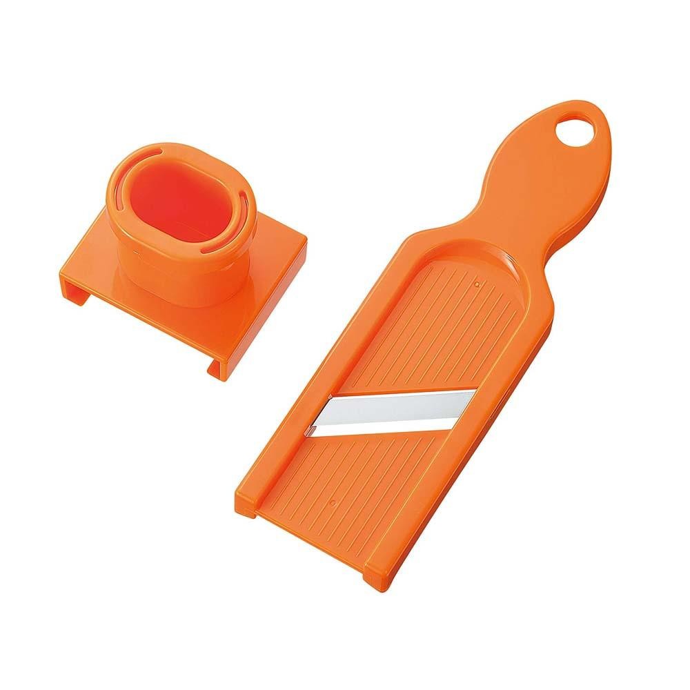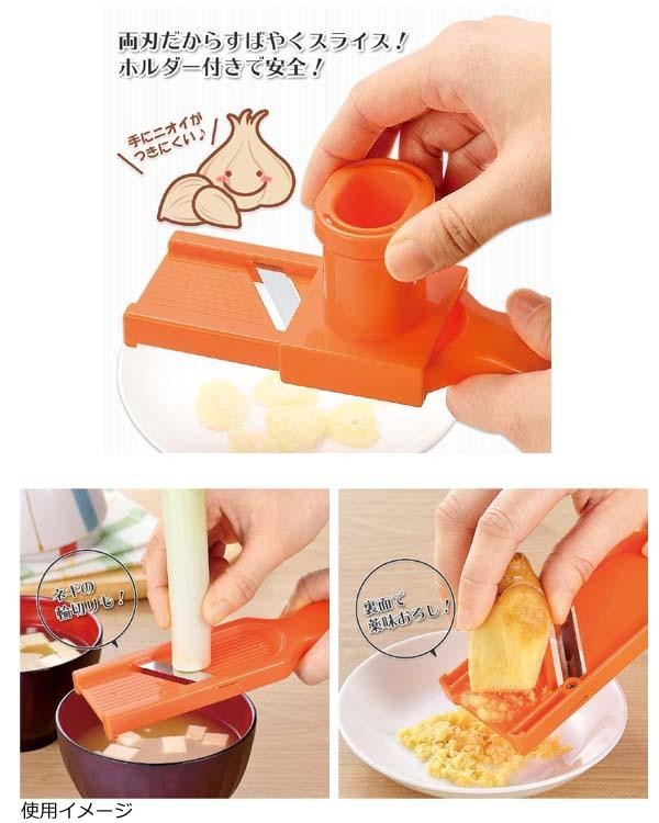 両刃ですばやくにんにくをスライスできるスライサーです。刃とニオイから手をガードするホルダー付きです。にんにんく以外にもネギの輪切り等にも使えます。裏面で薬味おろしもできますよ♪ |
