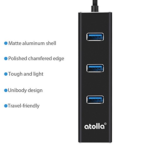 Design: Made of black matte aluminum with polished chamfered edge, atolla USB 3.0 Hub is tough and light. Unibody design with built-in 5" USB 3.0 Cable, travel-friendly