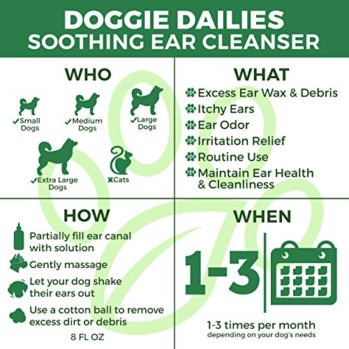-. Feature : 8 FL OZ, VETERINARIAN FORMULATED PET EAR DROPS, SAFE FOR ROUTINE USE: Our dog ear cleaner works great for cats too! Doggie Dailies ear wash is formulated using an effective blend of Aloe Vera, Tea Tree Oil, Witch Hazel, and Echinacea that work together to safely loosen and remove dirt, ear wax and, debris from your pet's ears leaving them clean, fresh, and feeling good. Doggie Dailies ear treatment for dogs and cats is safe to use routinely depending on your pet's needs / PET EAR WASH THAT'S EASY TO USE, HAS A FRESH & PLEASANT SCENT, AND WILL NOT BURN OR STING: Doggie Dailies ear cleaning solution for dogs and cats has a light and pleasant scent that will not overwhelm you or your pet. Each bottle comes with an easy-to-use applicator tip that makes administering the ear drops and cleaning your pet's ears much easier. Your pet will love our ear wash too because our special formula soothes their ears and will not burn or sting / PERFECT EAR CLEANING SOLUTION TO MAINTAIN YOUR PET'S EAR HEALTH & CLEANLINESS: Dogs and puppies of all sizes love our dog ear cleaner, and cats do too! No more irritated, smelly, itchy ears that you and your pet have to deal with. Help prevent yeast infections and ear mites and bring your pet some relief with an ear treatment for dogs and cats that actually works. Order your bottle of Doggie Dailies ear wash now, RISK FREE! / MADE IN THE USA, FDA REGISTERED FACTORY, EVERY BATCH TESTED BY INDEPENDENT LAB: Doggie Dailies ear cleaner for dogs and cats is made in the USA in our FDA registered factory that gets inspected annually by APHIS. Every batch of our natural ear cleaning solution is tested and certified safe by an independent lab before it is distributed / GREAT CUSTOMER SERVICE, 100% MONEY BACK GUARANTEE + FREE BONUS EBOOK: Your happiness is our top priority. If you are not satisfied with our product or service we'll provide you with a full refund and ensure we resolve any issue to your complete satisfaction. As a BONUS, you'll get a copy of our exclusive eBook, "Common Threats To Your Dog's Health (and what to do about them)" delivered to your inbox immediately after you purchase