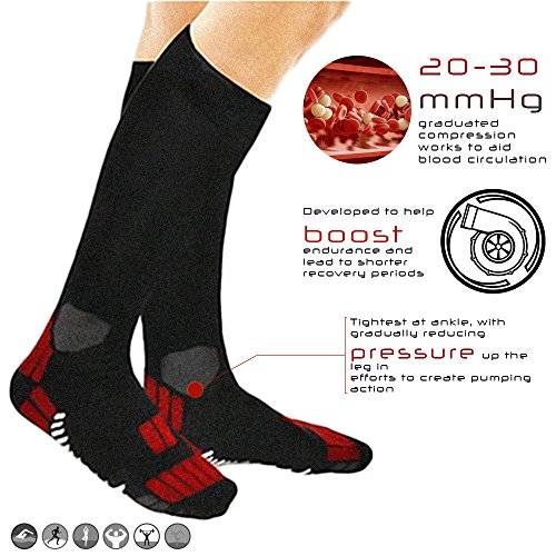The graduated compression of these socks helps to increase blood flow throughout lower extremities allowing for reduced pressure in the legs and feet. 20-30mmHg graduated compression works to aid blood circulation. Made to improve delivery of oxygen to muscles. Compression bands support achilles tendons