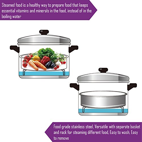 INNOVATIVE DESIGN - Food grade stainless steel, Versatile with separate basket and rack, the handles on the steamer basket provide ease to lift food from the pot