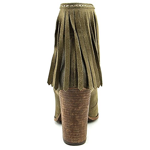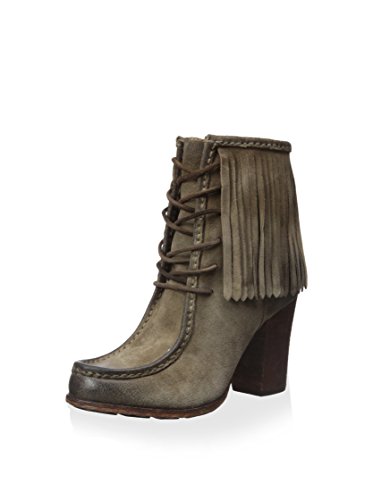 Soft fringe flows from the top line of these modern, moccasin-inspired Frye booties. Dark burnishing at the edges creates a worn effect. Lace-up closure. Scuffed, stacked heel and rubber-trimmed leather sole.