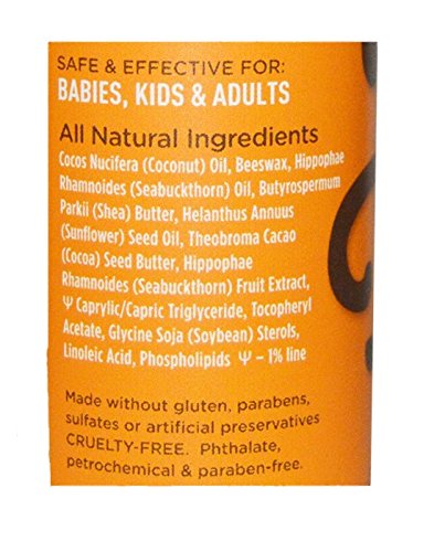 Sea Buckthorn has numerous documented health benefits including: the reduction of inflammation, irritation and discomfort, relieving dry skin, cracked heels and knuckles, promotes healing of acne, rosacea, eczema and psoriasis, hydrates and moisturizes skin. Sea Buckthorn contains Omega 3, 6, and 9; but it is also Earth's most abundant source of the rare Omega 7 (palmitoleic acid). Omega 7 is a key building block to healthy human skin. Sea buckthorn contains more than 190 biologically active compounds that can nourish the body's cells to protect the skin from free radicals and actually heal damage from environmental stressors and numerous skin conditions. It was recommended by DR OZ as best natural cure for acne and was listed as the hottest super-fruit in 2011! This product has been specially designed to be mild and safe for kids - as young as newborns - but is great for adults as well!Feature