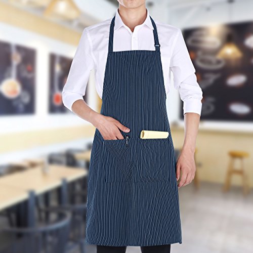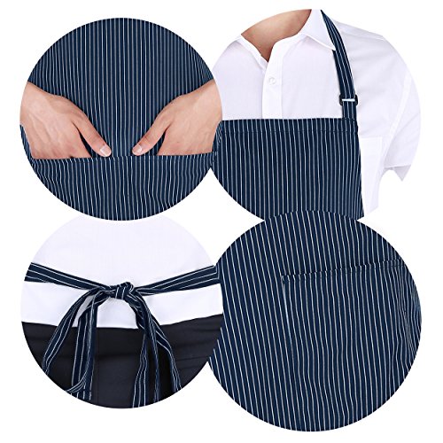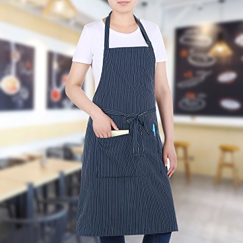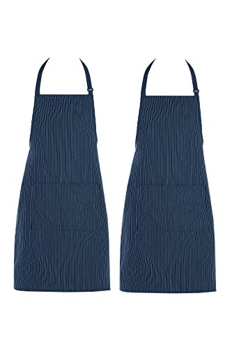 Chama 65%Polyester 35%Cotton Blue Pinstripes Adjustable Neck Strap Long Tie 2 Pockets Bib Apron For Men,Women Chef Baker Cooking Craft Garden Half Aprons for Servers Craftsmen --2 Pack (Blue)