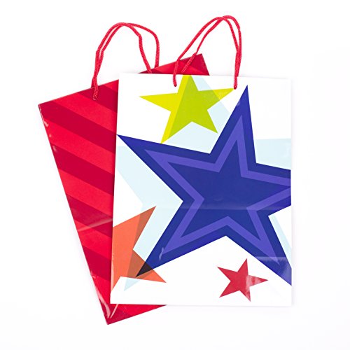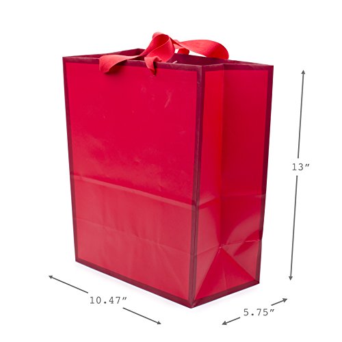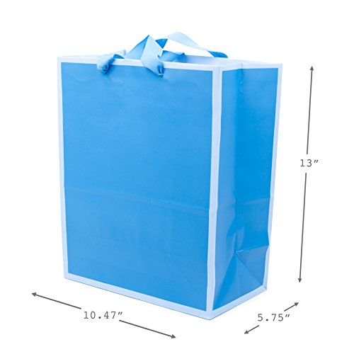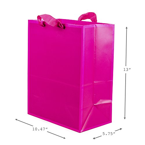 These colorful large sized gift bags measure 13.25 inches long by 10.5 wide by 10.5 inches deep and can support up to 10 pounds to hold books, clothing, stuffed animals, puzzles, action figures or fashion dolls. This three pack includes one each in hot pink, light blue, and red. Hallmark gift bags are made with paper from well-managed forests. Hallmark was founded in 1910 when 18-year-old J.C. Hall arrived in Kansas City, Missouri, with a couple of shoeboxes of postcards under his arm and the American dream in his heart. Hallmark greeting cards are sold online and in nearly 40,000 retail stores across the globe and people continue to recognize the iconic Hallmark brand as "the very best."Feature