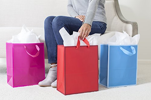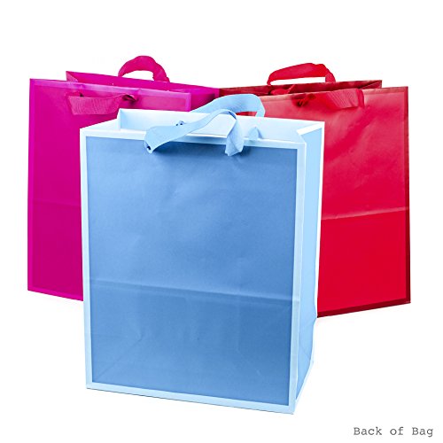 All-occasion large bag 3-pack is perfect for family and friends for presenting a special gift. Each solid color bag features contrast trim in blue, hot pink and red with matching ribbon handles.