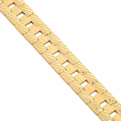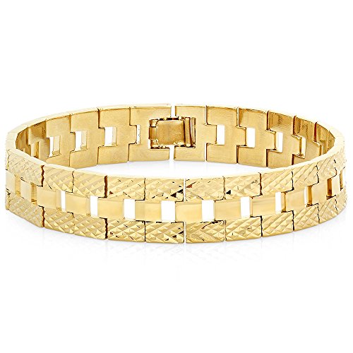 POLISHED & DURABLE - This 14k gold plated 9 inch bracelet is 12mm wide that fastens with a sturdy fold-over clasp creating a luxurious experience of a traditional solid gold chain