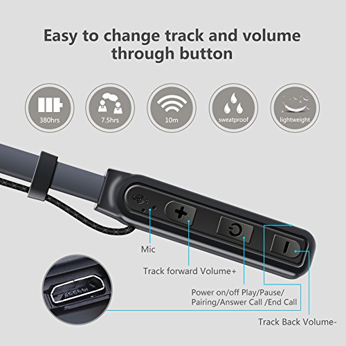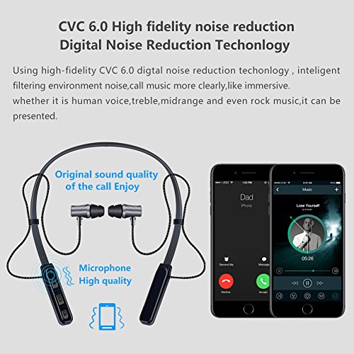 -. Feature : [GREAT AUDIO AND CALL QUALITY]:Using high-fidelity CVC6.0 digital noise reduction technology, intelligent filtering environment noise, call music more clearly, like immersive. whether it is human voice,treble, midrange and even rock music,It can be very good presentation. / [FLEXIBLE & LIGHTWEIGHT]: Neckband Designed Wearing Style With Body-contoured Fit.weighs only 0.78 oz in flexible and durable silicone neckband, great for easy carrying and all day comfort.convenient magnet earbuds can attracts each other when you don't used it, greatly decreasing the burden on ears and giving you a convenient storage way to carry around.Ensures a 100% comfortable fit especially when you are running, cycling, exercising and staying at home or in the Office. / [VOICE PROMPT]:Voice alarm when call comes in or pairing successfully,battery low/high. Power on/off, assisting you never to miss any incoming calls while busy with other stuff and mater your headphones status conveniently.IPX4 sweatproof, set free from worry of sweat damage while working out.you will not miss any phone calls within 32.8 ft. / [ADVANCED CSR BLUETOOTH 4.1]:could happen at any moment,Close proximity induction transmission,easy to use.Using CSR Bluetooth 4.1 stereo technology,Connect two devices at the same time, faster transmission, lower energy consumption, more able to retain the Unique sound!Compatible with most of bluetooth-enabled devices,such as iPhone 7/iPhone 7 Plus/iPhone 6s/iPhone 6s Plus/Huawei P9 Honor8/Samsung Note 5/S7 Edge/Moto Z/HTC 10/HTC Desire 10/ASUS Zenphone 3,etc. / [SHORTER CHARGE TIME BUT LONGER USE TIME]:You only need to charge 1 hours, you can guarantee 7-8 hours of call, 7-8 hours of music to enjoy 380 hours of standby time.We're sure you'll love , but if you aren't happy with them, at any time, simply let us know and we'll promptly send you a full refund.