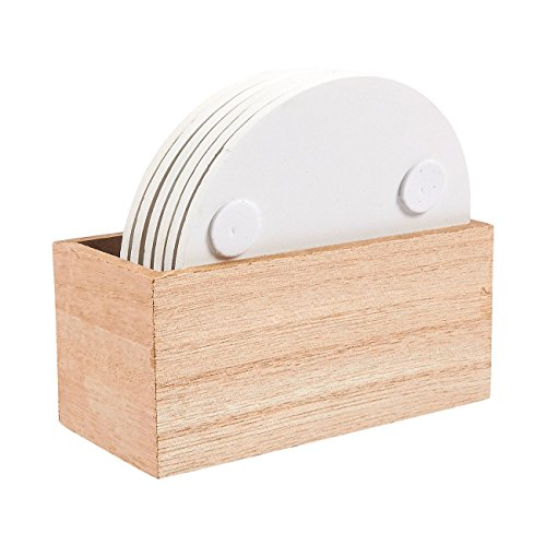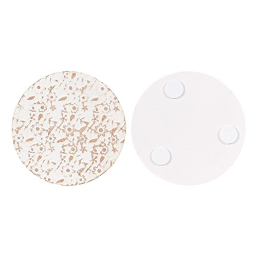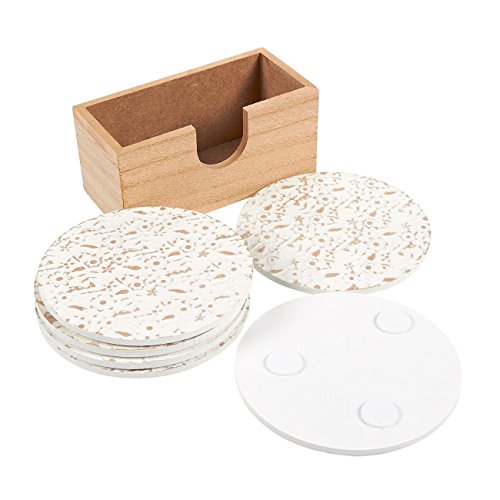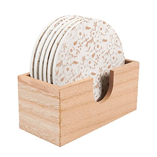 6 Round Wooden Coasters - Drink and Table Coaster Set with Holder, White Floral Design, 3.8 Inches in Diameter