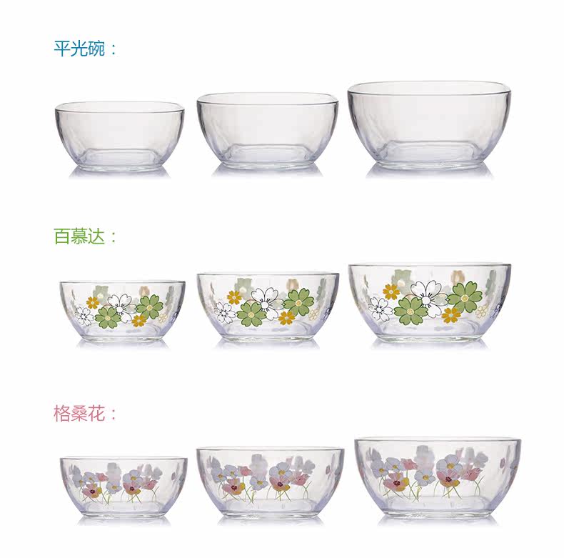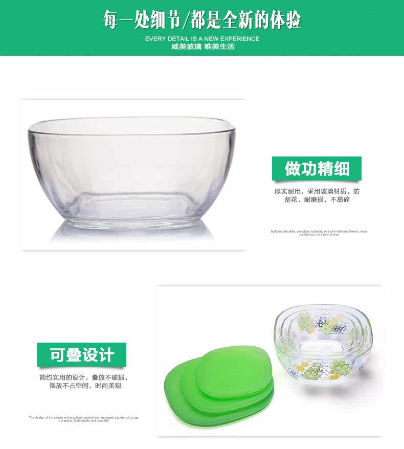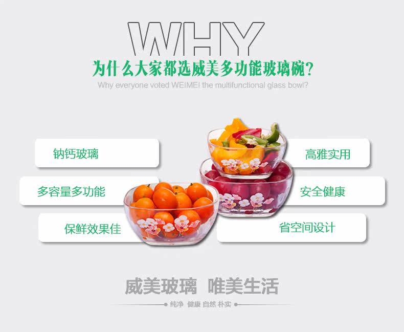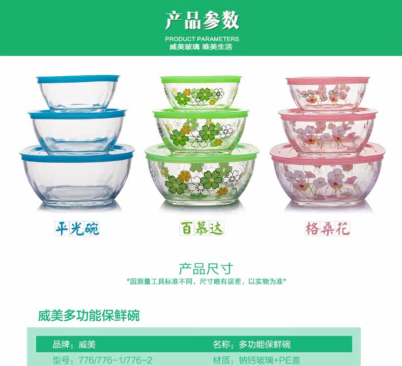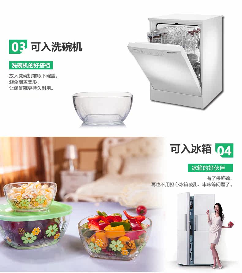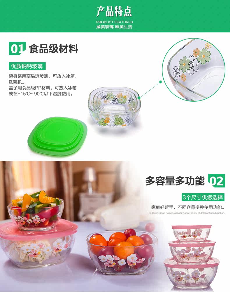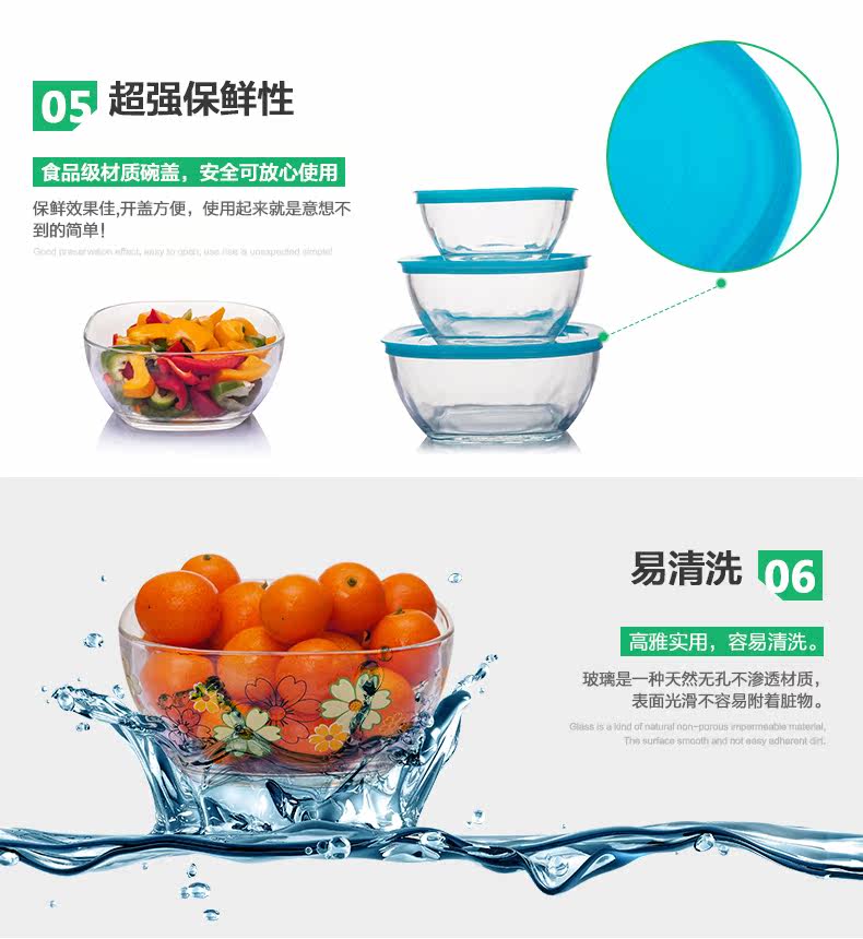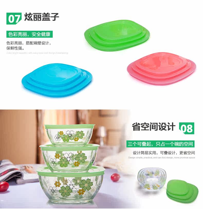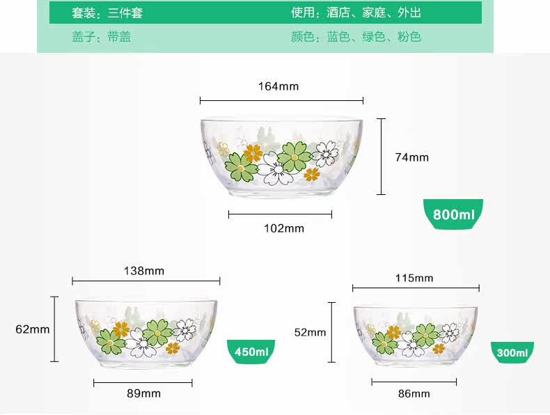 威美带盖玻璃碗泡面碗保鲜碗炫彩色三件套贴花餐具套装甜品沙拉碗