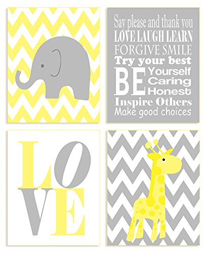 The Kids Room By Stupell Yellow And Grey Chevron Elephant And Giraffe Typography 4-Pc. Rectangle Wall Plaque Set, Proudly Made in USA