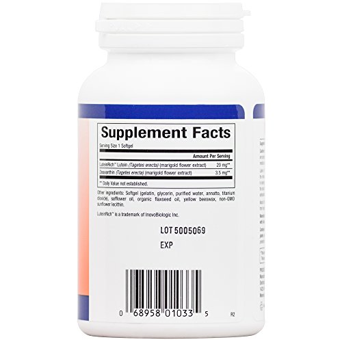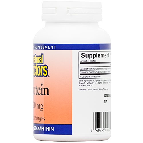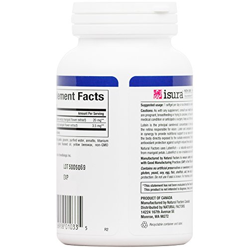 Lutein is a yellow-orange carotene that research has shown to offer powerful support to help the body protect the eyes, lungs, and arteries from free radical damage. Lutein and a related carotene Zeaxanthin are found concentrated in the eyes (particularly in the macula and the lens) where they help to absorb damaging blue light, quench singlet oxygen, and inhibit lipid peroxidation. Natural Factors Lutein provides 20 mg of natural Lutein in a highly absorbable form derived from FloraGlo Lutein (derived from marigold flowers) and is purified according to a patented process.