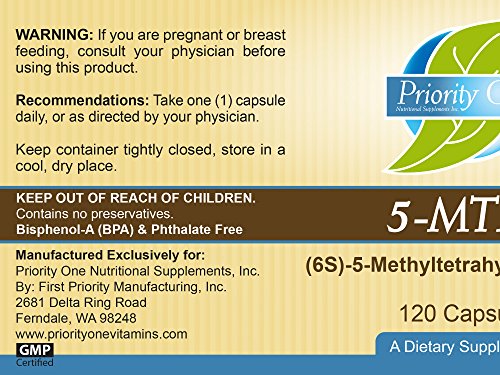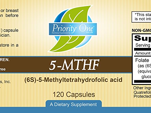 Studio : Priority One Nutritional Supplements Inc./First Priority Manufacturing Inc. Publisher : Priority One Nutritional Supplements Inc./First Priority Manufacturing Inc. Binding : Health and Beauty Product Description 5-MTHF is the most bioavailable and active form of folic acid. At the cellular level 5-MTHF is used for DNA biosynthesis. It benefits the cysteine cycle and is used in the regulation of homocysteine. [6]-5-Methyltetrahydrofolate efficiently supports nervous system function. This is the predominant folate in circulation and the only folate that can cross the blood-brain barrier.*5-MTHF is an active, methylated form of folate. Our 5MTHF is the preferred choice for those with absorption or known metabolic markers it is also an excellent source of folate for pregnant women.* Gluten free and Non-GMO. Our Priority One Vitamins products are made in our own cGMP certified facility in the USA. Priority One Vitamins a leading manufacturer of nutritional supplements used by healthcare practitioners today - including naturopathic, chiropractic, nutrition, acupuncture, as well as a variety of general health and specialty practitioners. 0