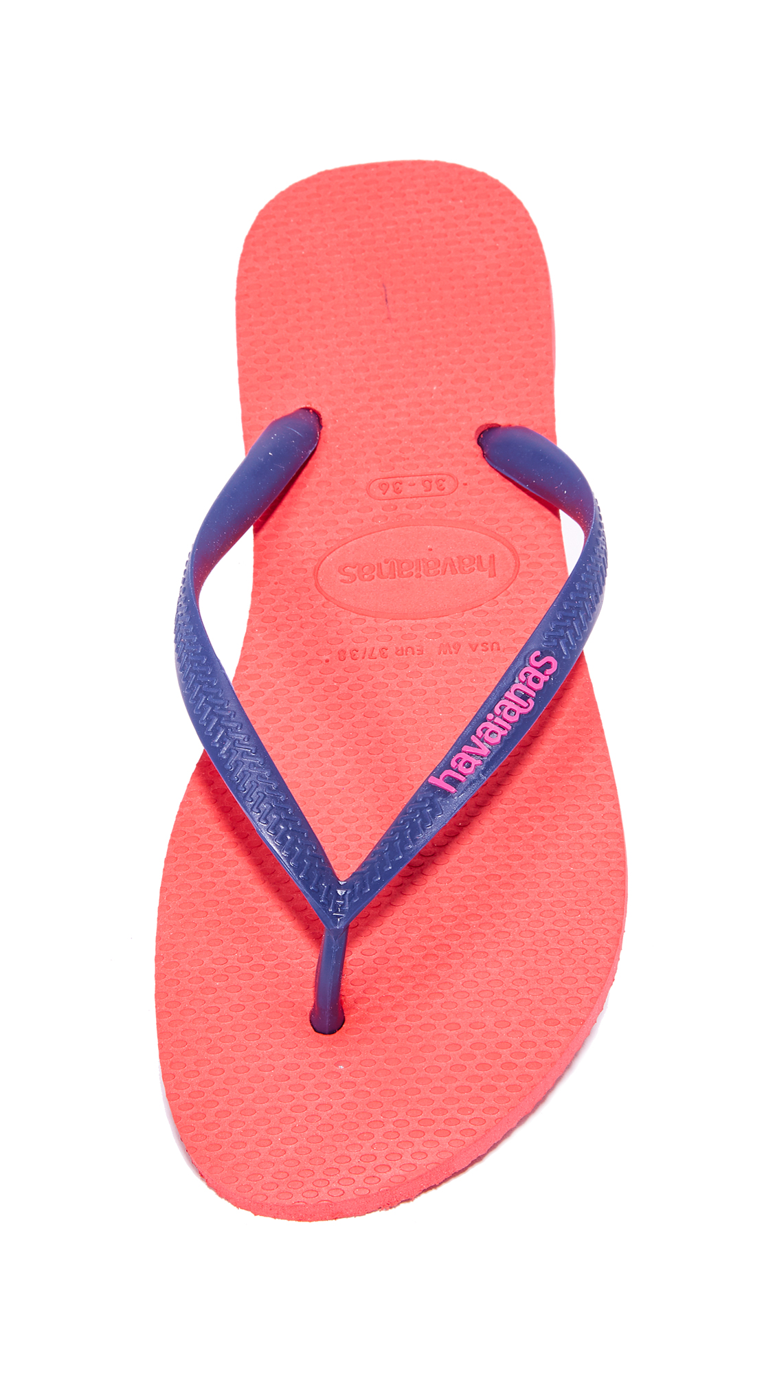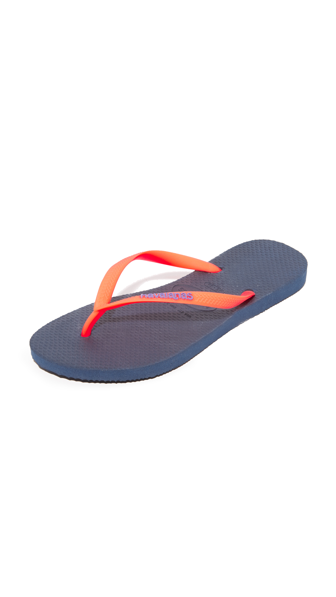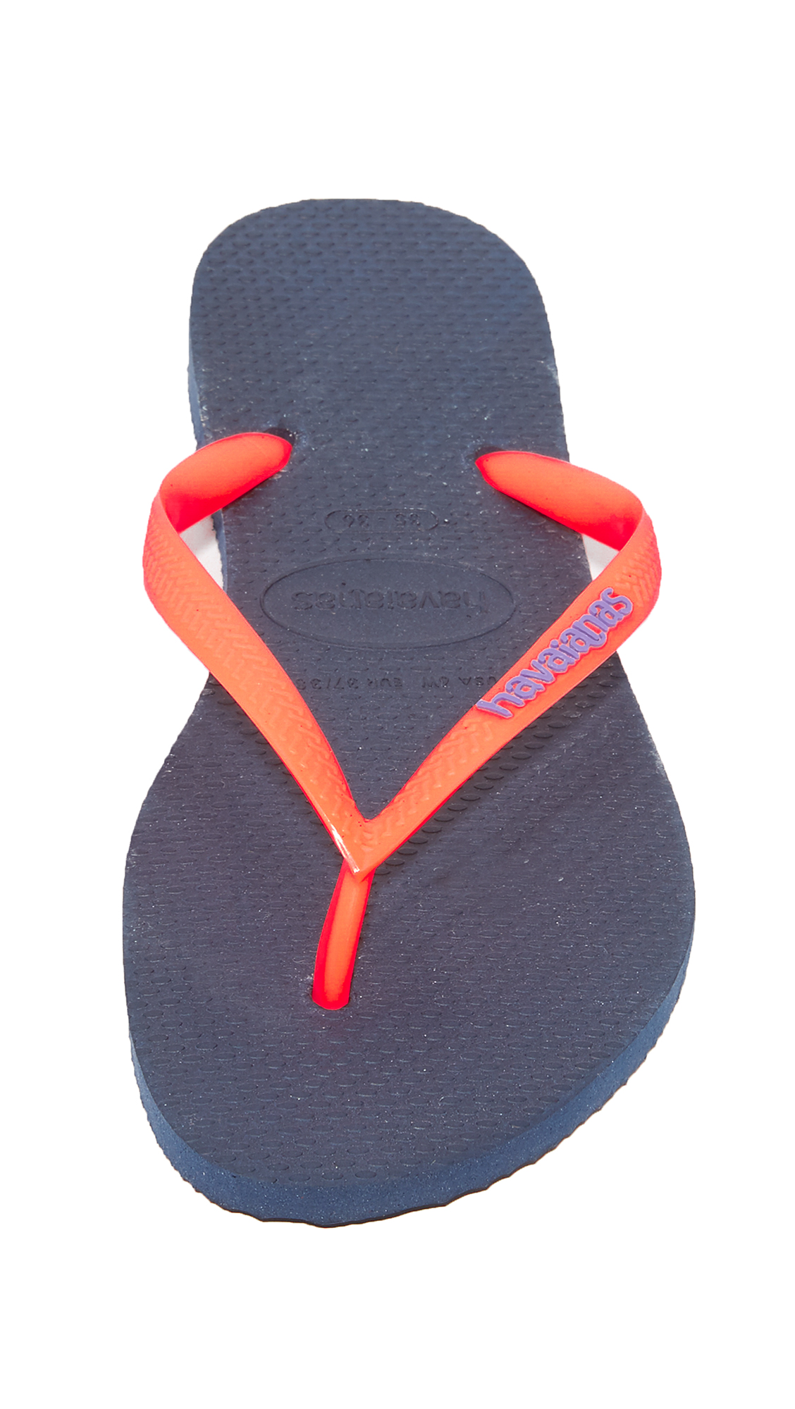 A neon thong strap adds a splash of color to these casual Havaianas flip-flops. Rubber sole.Fabric: Rubber.Imported, Brazil.COLOR: Mentha Green Navy Blue are brighter than they appear in still photos.