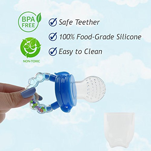 -. Feature : HIGH QUALITY FRESH FOOD FEEDER designed to introduce solid foods to your babies. Similar in appearance to a pacifier, this fruit feeder is designed to open so you are able to place food into the nipple. A safe way to introduce fresh food to your baby / 100% SAFE FOOD GRADE SILICONE nipples, non-toxic, hypoallergenic, BPA free. Newly designed latch that reduces the risk of snags, and pokes / SAFE, DEPENDABLE TEETHER: Allows your child to not only try solid foods, but also to sooth during teething. Frozen fruits, or ice chips packed into the soft silicone feeder provides a safe way for your baby to teeth. Fun rattle design keeps baby interested / EASY TO CLEAN with soap and water, and the silicone nipple is boil safe for disinfection. Product completely breaks down so you are able to fully, and properly clean