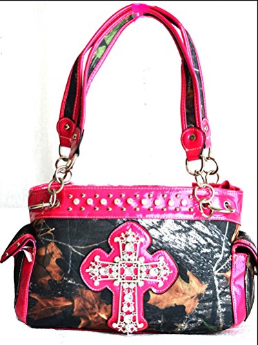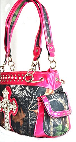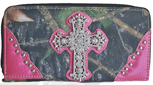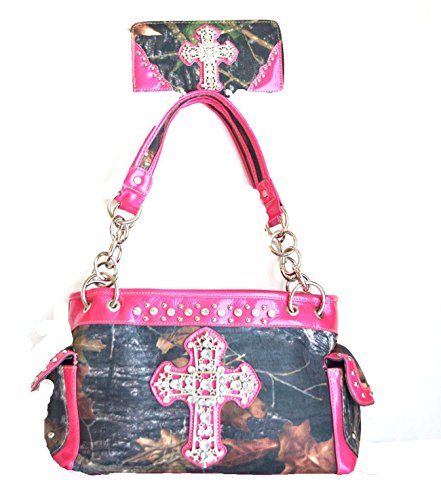 -. Title : Western Camo Mossy Oak Rhinestone Cross Handbag Purse Hot Pink Wallet