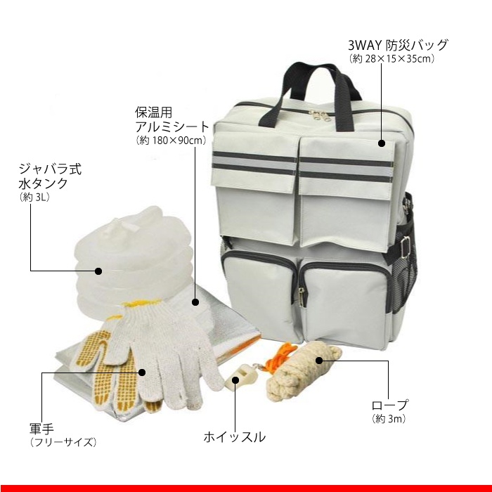 3WAY방재 백 더블/약28×15×35cm더《바라》식 수 탱크/약3L보온용 알루미늄 씨트/약180×90cm목장갑/사이즈 프리로프/약3mwhistle(각1)