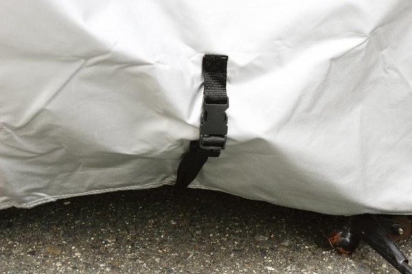 | 強風対策のワンタッチベルトを中央部に付けています。前後各2ヶ所に鍵穴があり、Uロックを簡単にセットできます。様々な対策のアイデアを取り入れたバイクカバーです!! |