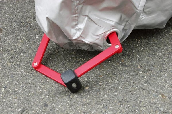 強風対策のワンタッチベルトを中央部に付けています。前後各2ヶ所に鍵穴があり、Uロックを簡単にセットできます。様々な対策のアイデアを取り入れたバイクカバーです!! |