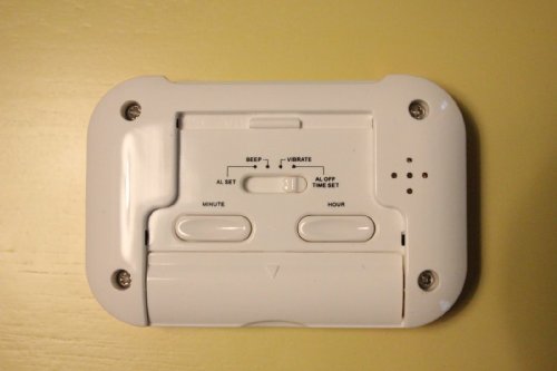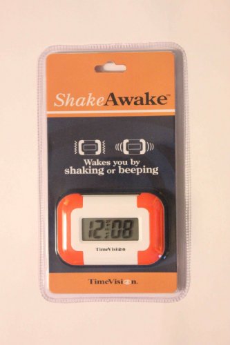 The Compact Vibrating Alarm Clock features a pulsing vibration alarm that is helpful for the deaf and hard of hearing, and is also convenient for those who want to wake up without disturbing their partner. This compact size vibration alarm tucks easily under your pillow and is ideal for travel. It's even small enough to carry in your pocket as an appointment and medication reminder. The built-in fold-out stand allows for use on a nightstand and doubles as a protective cover for the buttons, preventing accidental button presses. Uses one AAA battery (not included.) 6-Month Manufacturer's Limited Warranty. Color: White with orange accents. (Color may vary.) OTHER FEATURES and SPECIFICATIONS: LCD display with 0.50" bold black numbers Backlight for nighttime viewing (just press Snooze to activate) Easy operation: 2 buttons for setting time, plus a slide switch and snooze bar Alarm sounds for 1 minute 4-minute snooze Dimensions: 3" wide x 2" high x 0.625" thick Weight: 2 oz. (with battery)