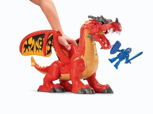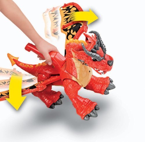 The Fisher-Price Imaginext Castle Dragon is no ordinary dragon. The handle on the Castle Dragon’s back controls the action. Squeeze it and the dragon “rooaarrss”! Another squeeze and the dragon lunges forward and grabs with its mouth – dinner could be an unlucky knight or a ball. Squeeze the handle again and the dragon “spits” it out. Another squeeze adds sound effects to the fun. For children ages 3-8 years.