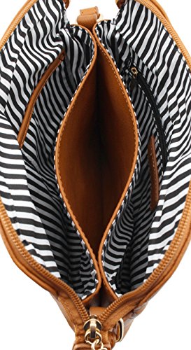 Multi compartments cross body bag. Even 500ml(16.9 fl oz) water bottle fits!!! 1 zipper pocket in front with tassels detail. 3 compartments with top zip closure. 1 zipper pocket and 2 open pockets inside. Roomy and large size(10"L x 9.75"H x 2.5"W) cross body bags!!!Feature