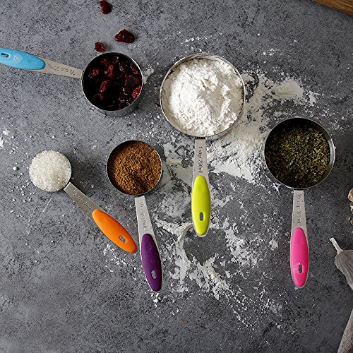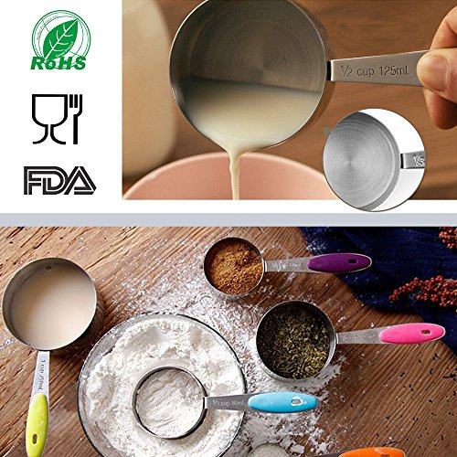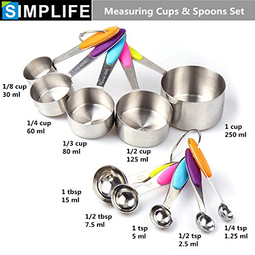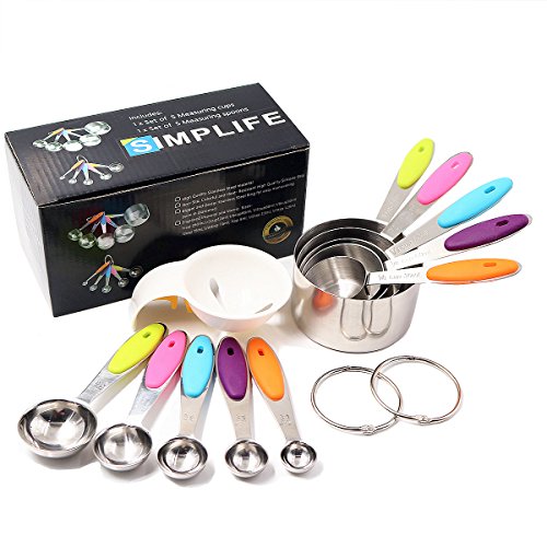 Why you choose the SIMPLIFE Measuring Cups and Spoons? - Our cups and spoons have no sharp edges, which makes baking and cooking safe with your little ones - The engraved measurement markings will not fade away and the cups and spoons are perfect for dry as well as wet ingredients - Accurate measurements maintain your portion size and ensure your favorite recipes are always how you want it to be - Detachable design, cups and spoons can be used separately and easy to hang - Engraved handle with cup size and ml, teaspoon and tablespoon clearly indicated - Polished finish with colorful silicone handles - makes these cups stylish and lovely
